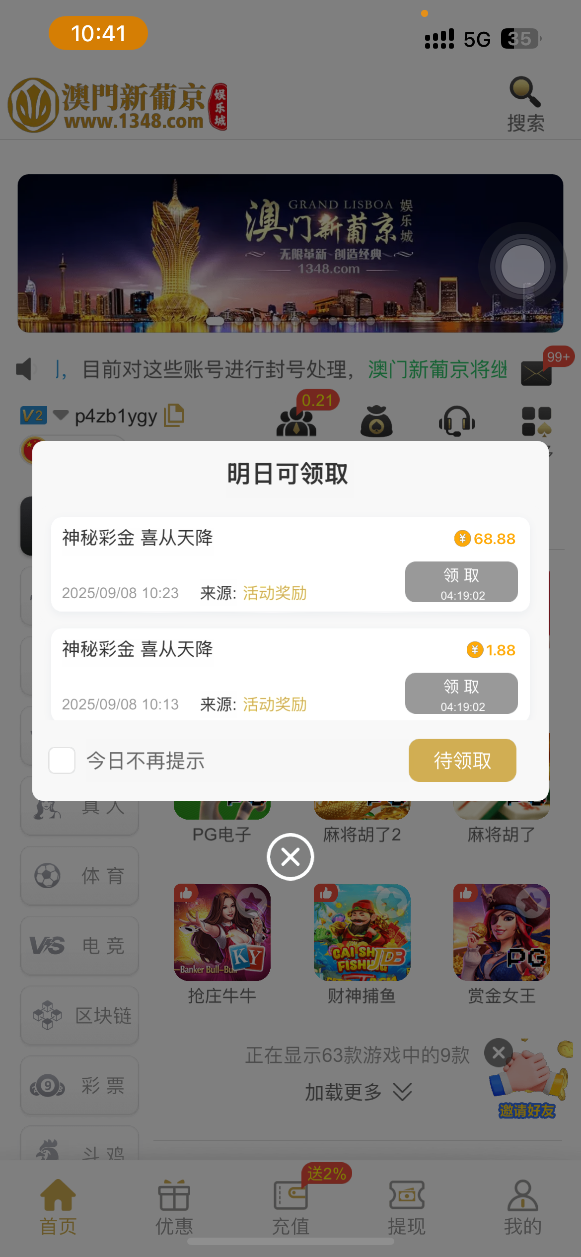 有号的活着有娱乐过的去看下,送了神秘彩金